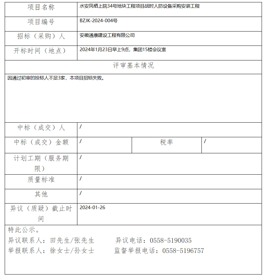 水安鳳棲上院34號地塊工程項目戰(zhàn)時人防設(shè)備采購安裝工程中標(biāo)(成交)結(jié)果公示