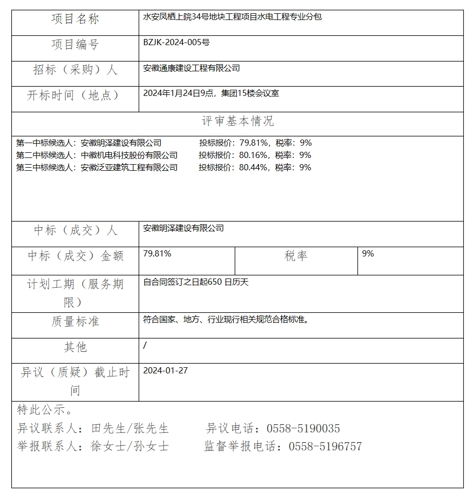 水安鳳棲上院34號地塊工程項目水電工程專業(yè)分包中標(成交)結果公示