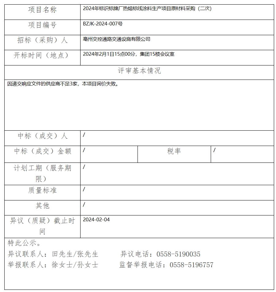 2024年標識標牌廠熱熔標線涂料生產(chǎn)項目原材料采購(二次)中標(成交)結(jié)果公示