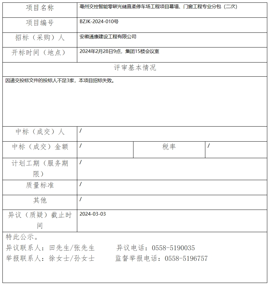 亳州交控智能零碳光儲直柔停車場工程項目幕墻、門窗工程專業(yè)分包(二次)中標(成交)結(jié)果公示