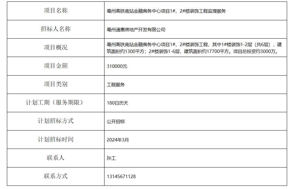 亳州高鐵南站金融商務(wù)中心項目1#、2#樓裝飾工程監(jiān)理服務(wù)招標(biāo)計劃