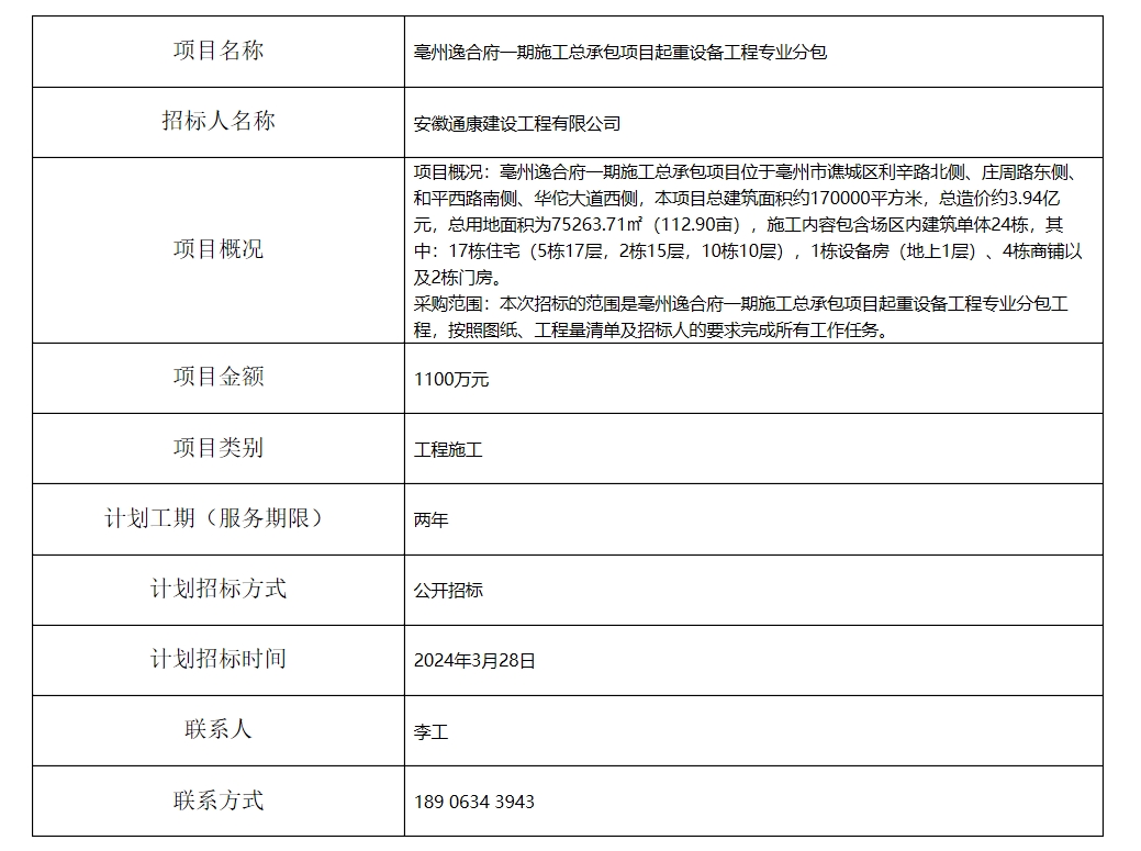亳州逸合府一期施工總承包項(xiàng)目起重設(shè)備工程專業(yè)分包招標(biāo)計(jì)劃