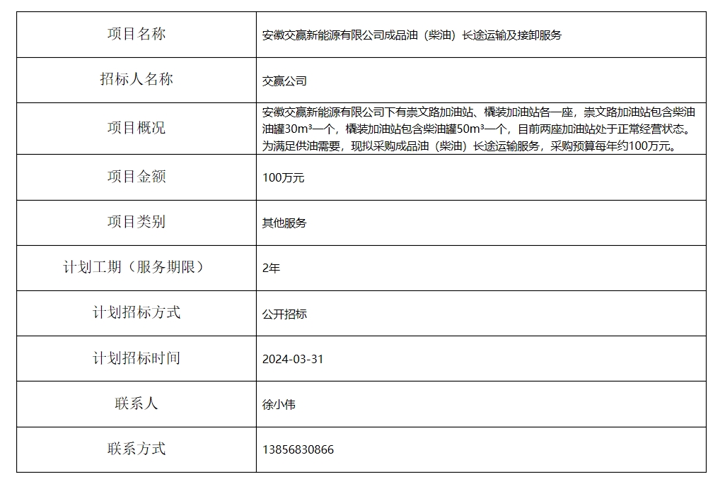 安徽交贏新能源有限公司成品油(柴油)長(zhǎng)途運(yùn)輸及接卸服務(wù)招標(biāo)計(jì)劃