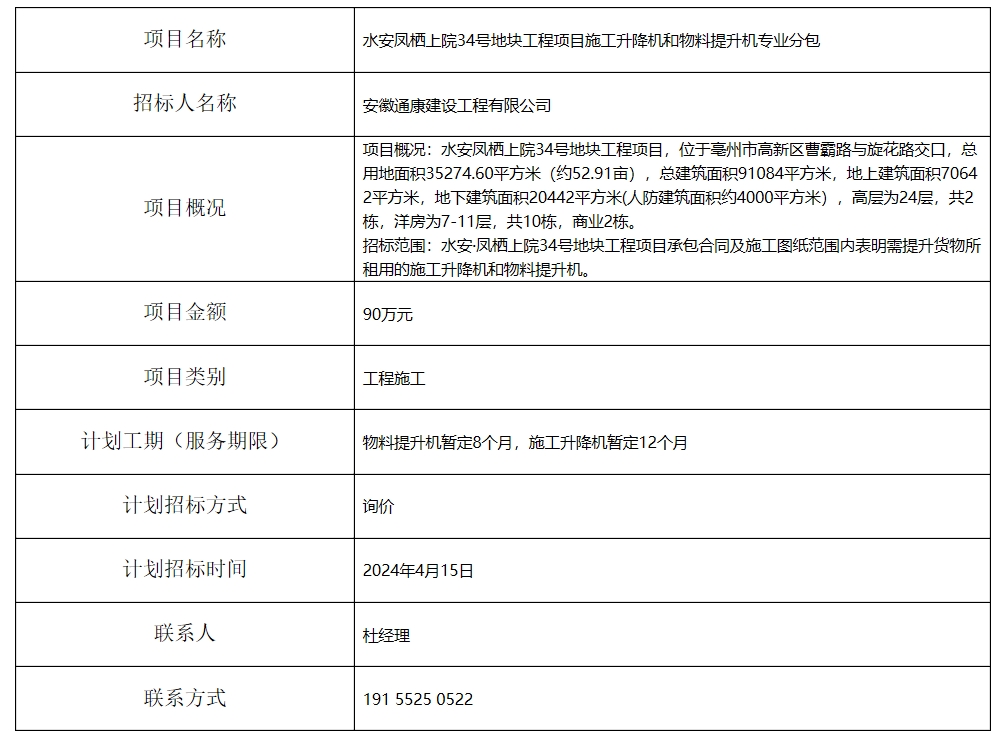 水安鳳棲上院34號地塊工程項目施工升降機和物料提升機專業(yè)分包招標計劃