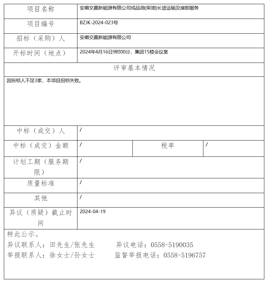 安徽交贏新能源有限公司成品油(柴油)長途運(yùn)輸及接卸服務(wù)中標(biāo)(成交)結(jié)果公示