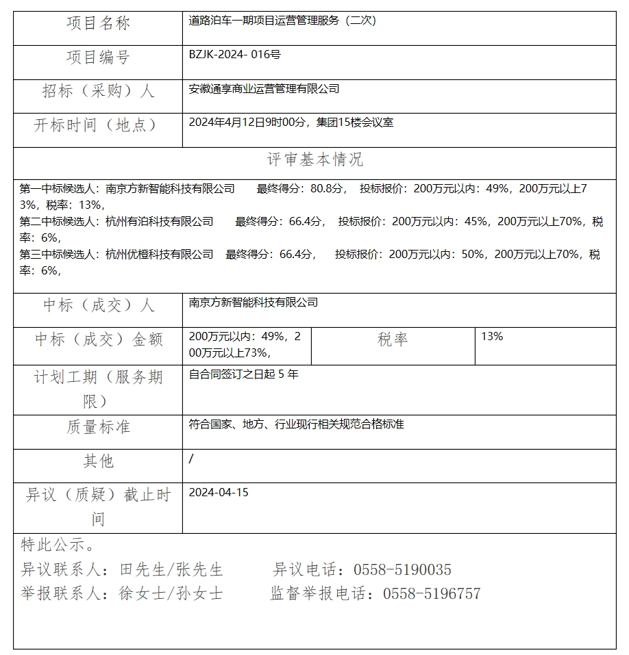道路泊車一期項目運營管理服務(wù)(二次)中標(biāo)(成交)結(jié)果公示