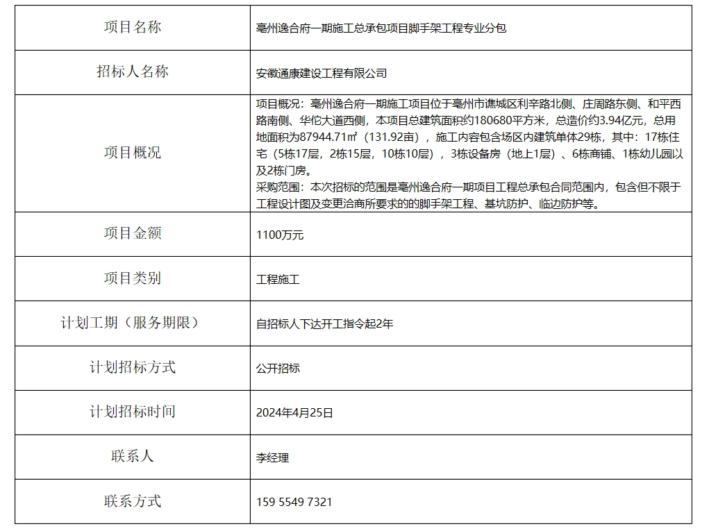 亳州逸合府一期施工總承包項目腳手架工程專業(yè)分包招標計劃