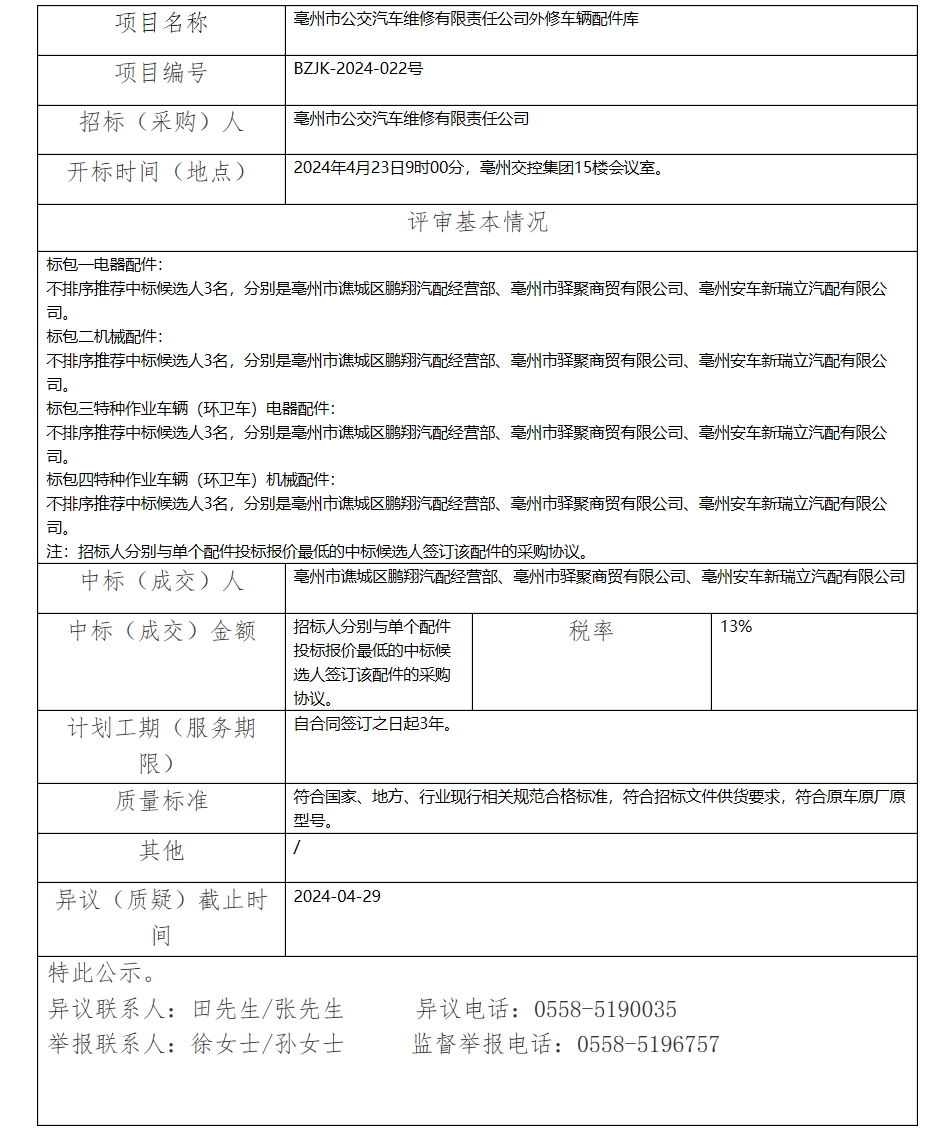 亳州市公交汽車維修有限責任公司外修車輛配件庫中標(成交)結(jié)果公示