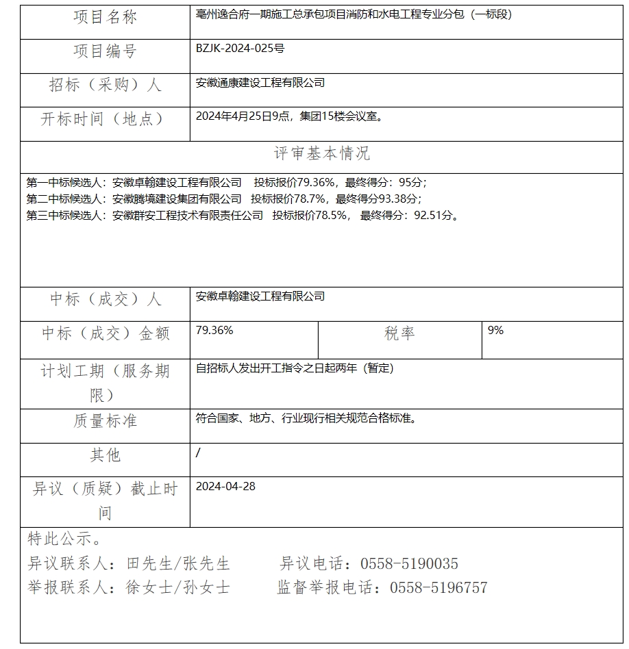 亳州逸合府一期施工總承包項(xiàng)目消防和水電工程專業(yè)分包(一標(biāo)段)中標(biāo)(成交)結(jié)果公示