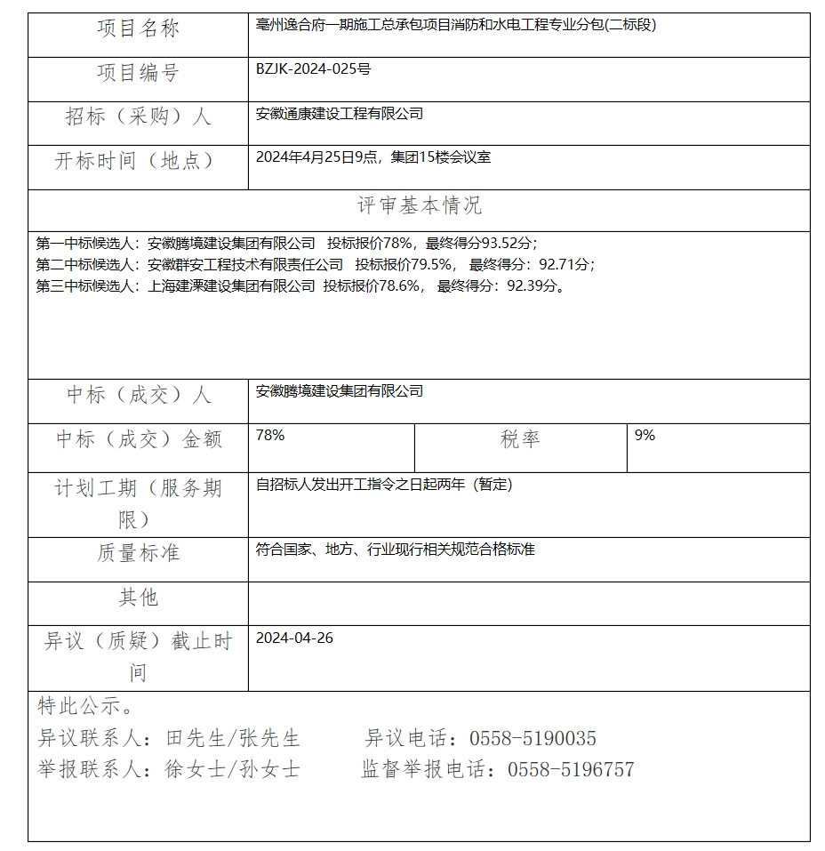 亳州逸合府一期施工總承包項(xiàng)目消防和水電工程專業(yè)分包(二標(biāo)段)中標(biāo)(成交)結(jié)果公示