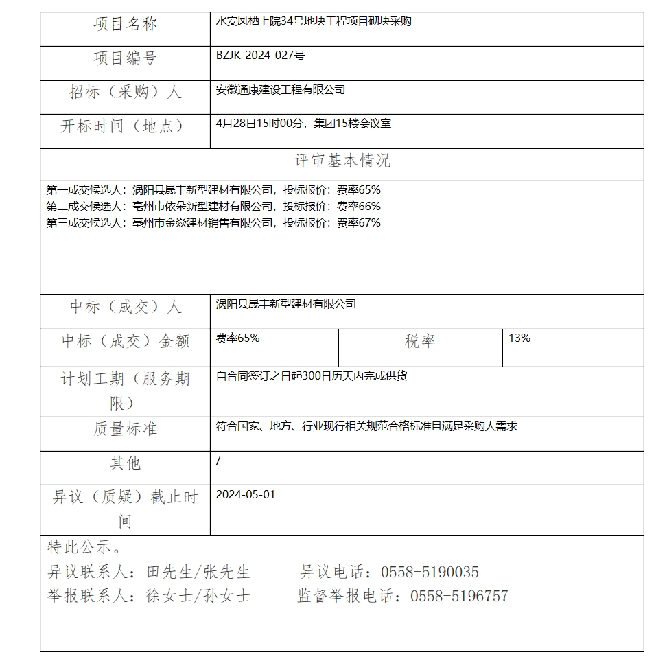 水安鳳棲上院34號地塊工程項(xiàng)目砌塊采購中標(biāo)(成交)結(jié)果公示