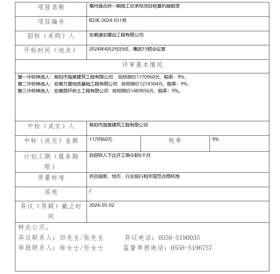 亳州逸合府一期施工總承包項目樁基機械租賃中標(成交)結果公示
