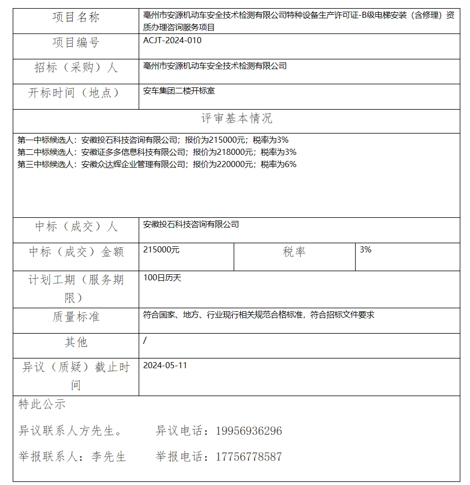 亳州市安源機(jī)動(dòng)車安全技術(shù)檢測有限公司特種設(shè)備生產(chǎn)許可證-B級電梯安裝(含修理)資質(zhì)辦理咨詢服務(wù)項(xiàng)目中標(biāo)(成交)結(jié)果公示