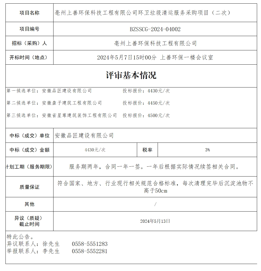 亳州上善環(huán)??萍脊こ逃邢薰经h(huán)衛(wèi)垃圾清運(yùn)服務(wù)采購項(xiàng)目(二次) 項(xiàng)目中標(biāo)結(jié)果公示