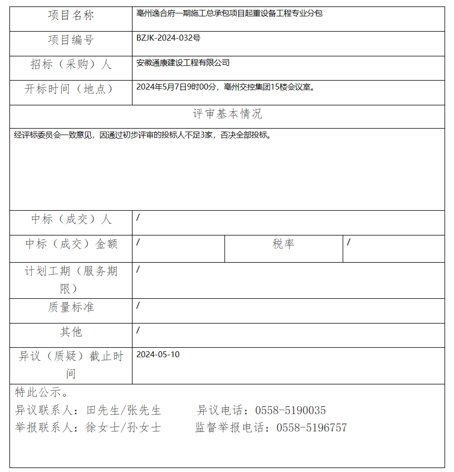 亳州逸合府一期施工總承包項(xiàng)目起重設(shè)備工程專(zhuān)業(yè)分包中標(biāo)(成交)結(jié)果公示