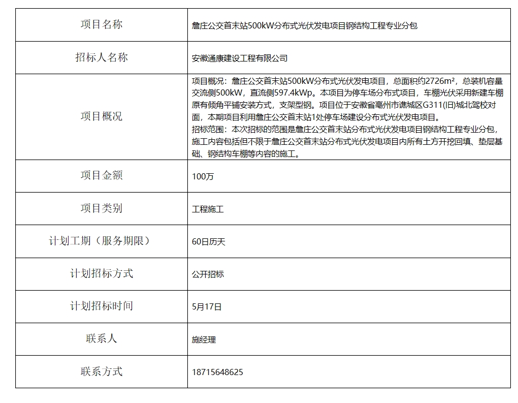 詹莊公交首末站500kW分布式光伏發(fā)電項目鋼結(jié)構(gòu)工程專業(yè)分包招標計劃