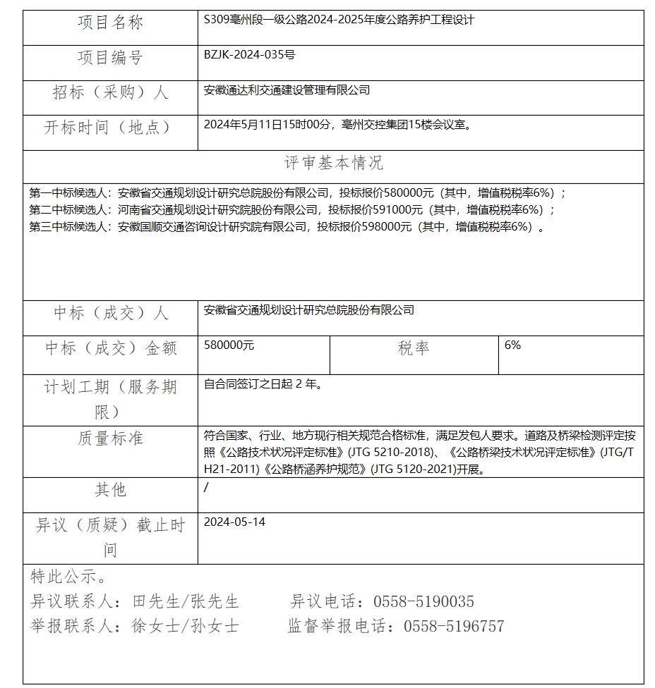 S309亳州段一級公路2024-2025年度公路養(yǎng)護工程設(shè)計中標(成交)結(jié)果公示