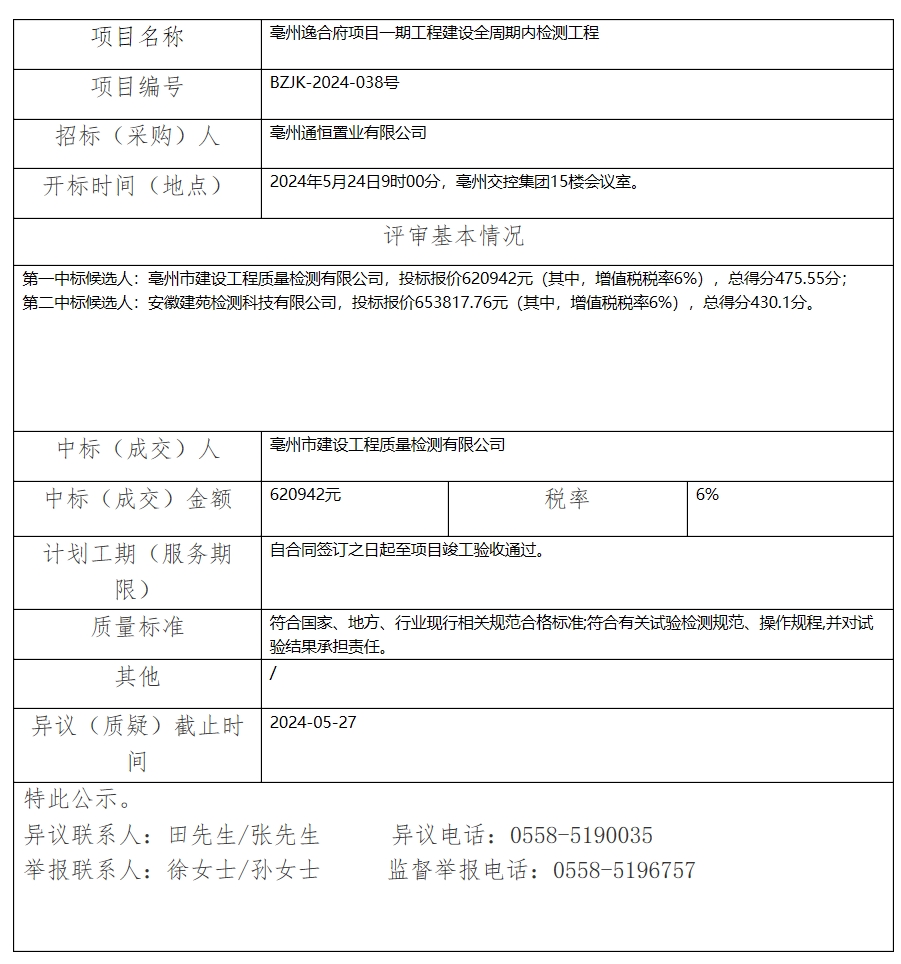 亳州逸合府項(xiàng)目一期工程建設(shè)全周期內(nèi)檢測(cè)工程中標(biāo)(成交)結(jié)果公示