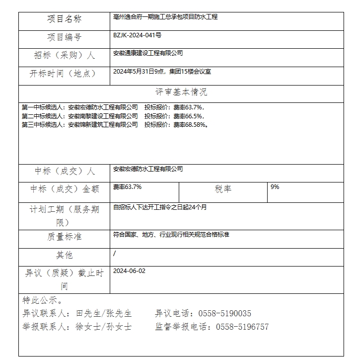 亳州逸合府一期施工總承包項目防水工程中標(biāo)(成交)結(jié)果公示
