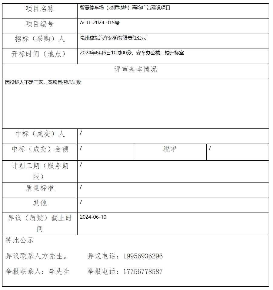 智慧停車場(趙橋地塊)高炮廣告建設(shè)項目中標(成交)結(jié)果公示