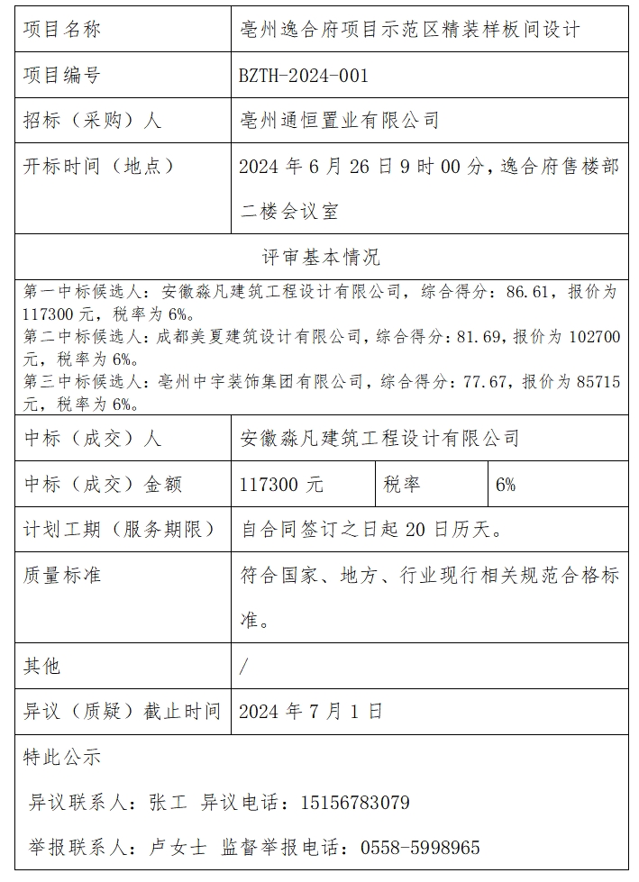 亳州逸合府項(xiàng)目示范區(qū)精裝樣板間設(shè)計(jì)中標(biāo)結(jié)果公示
