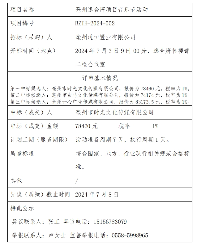 亳州逸合府項目音樂節(jié)活動中標(biāo)結(jié)果公示
