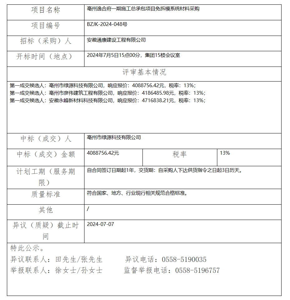亳州逸合府一期施工總承包項目免拆模系統(tǒng)材料采購中標(成交)結(jié)果公示