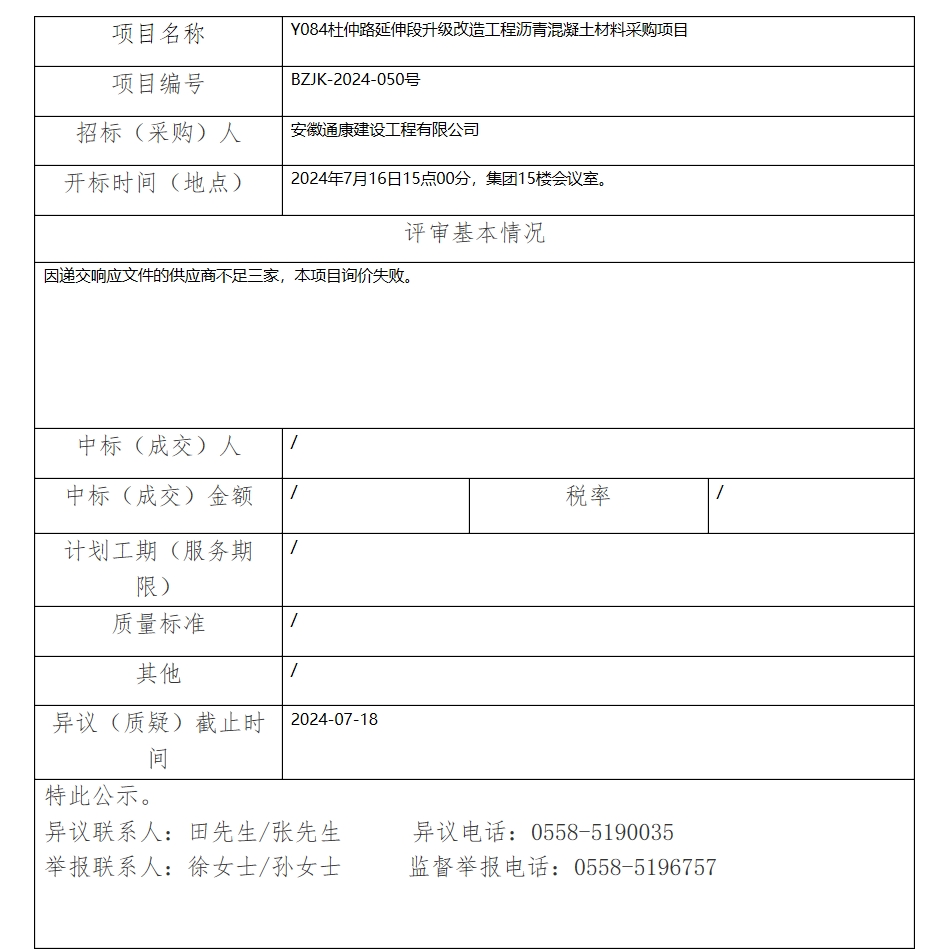Y084杜仲路延伸段升級改造工程瀝青混凝土材料采購項(xiàng)目中標(biāo)(成交)結(jié)果公示