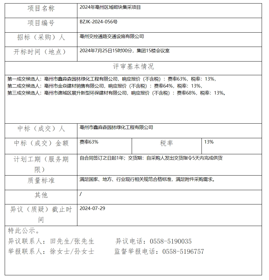 2024年亳州區(qū)域砌塊集采項(xiàng)目中標(biāo)(成交)結(jié)果公示