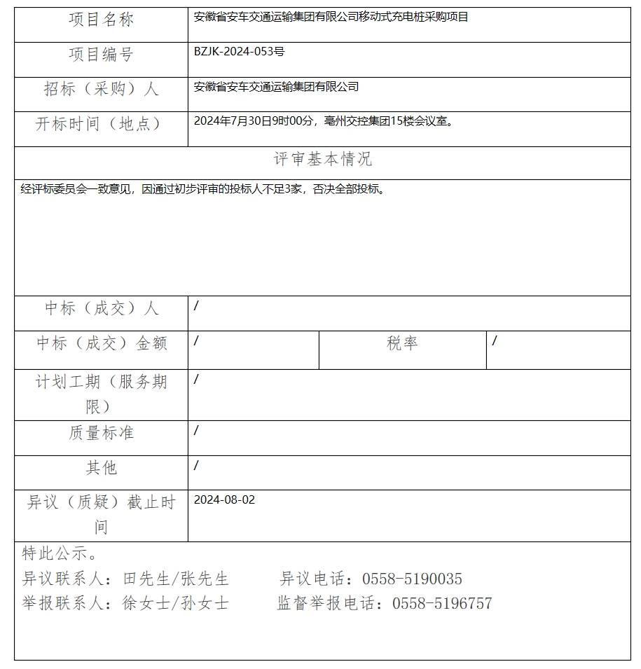 安徽省安車交通運(yùn)輸集團(tuán)有限公司移動(dòng)式充電樁采購項(xiàng)目中標(biāo)(成交)結(jié)果公示