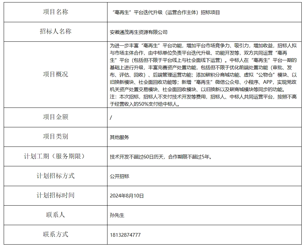 “亳再生”平臺迭代升級(運營合作主體)項目招標(biāo)計劃