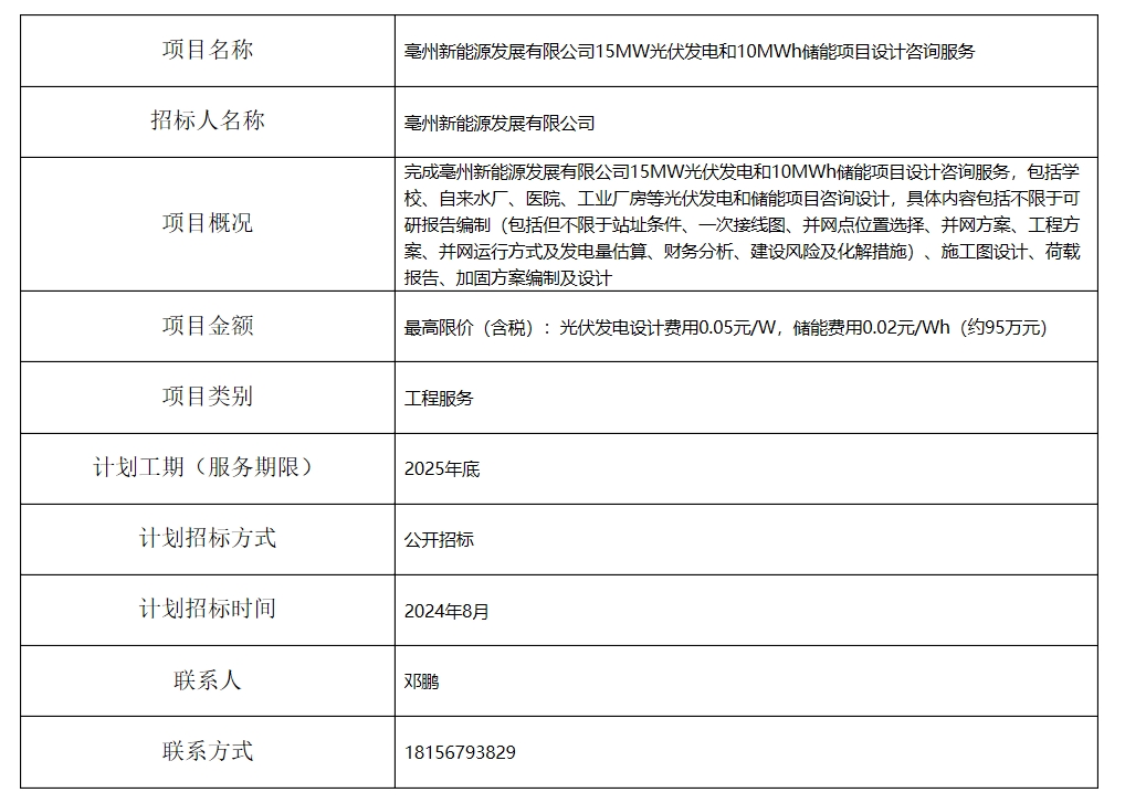 亳州新能源發(fā)展有限公司15MW光伏發(fā)電和10MWh儲(chǔ)能項(xiàng)目設(shè)計(jì)咨詢服務(wù)招標(biāo)計(jì)劃