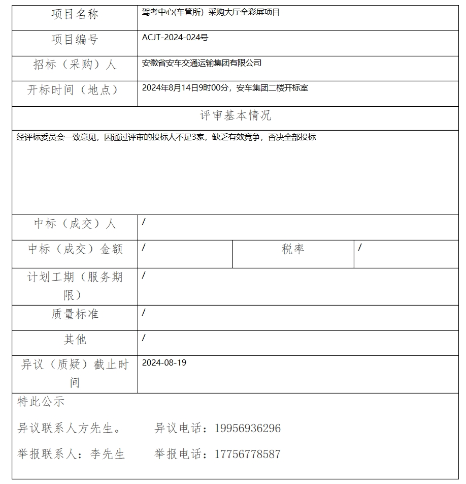 駕考中心(車管所)采購大廳全彩屏項(xiàng)目中標(biāo)(成交)結(jié)果公示