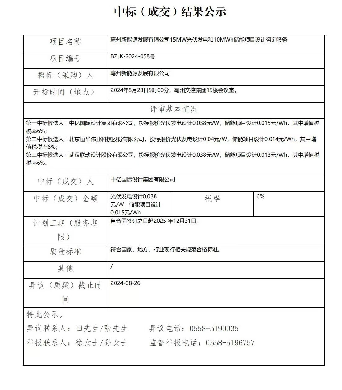 亳州新能源發(fā)展有限公司15MW光伏發(fā)電和10MWh儲能項目設計咨詢服務中標(成交)結(jié)果公示