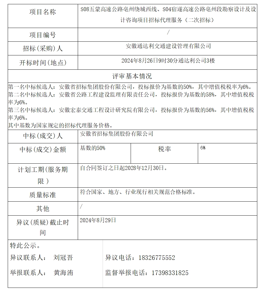 S08五蒙高速公路亳州繞城西線、S04宿遂高速公路亳州段勘察設(shè)計及設(shè)計咨詢項目招標代理服務(wù)(二次招標)中標(成交)結(jié)果公示