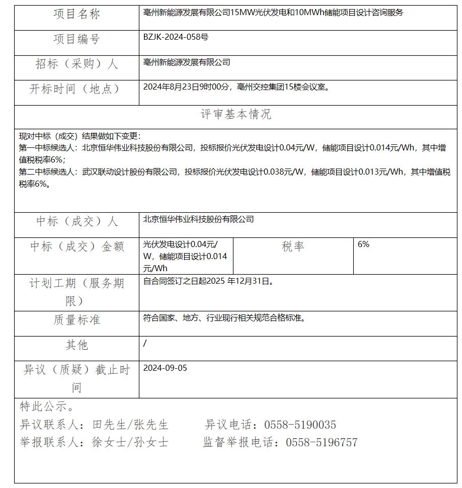 亳州新能源發(fā)展有限公司15MW光伏發(fā)電和10MWh儲能項目設計咨詢服務中標結果變更公示