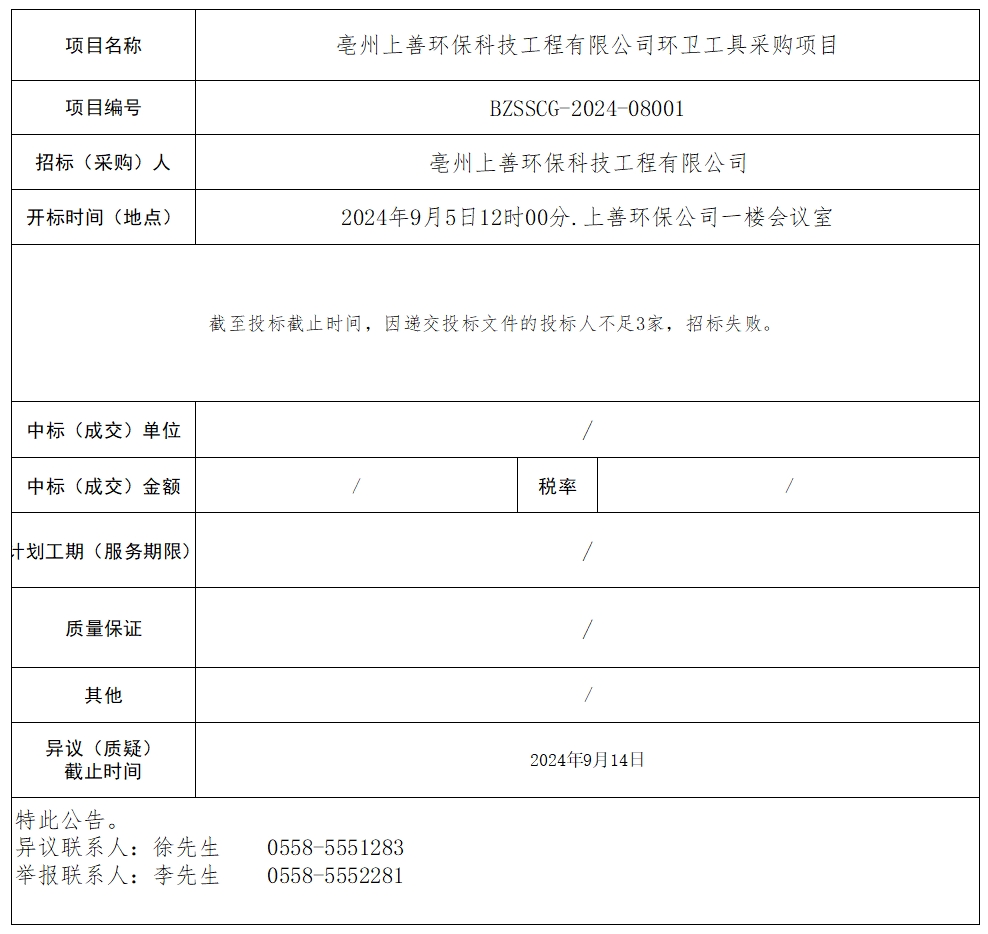 亳州上善環(huán)保科技工程有限公司環(huán)衛(wèi)工具采購項(xiàng)目中標(biāo)結(jié)果公示