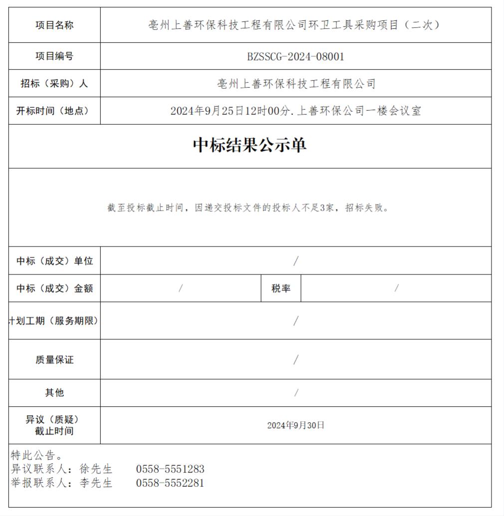 亳州上善環(huán)保科技工程有限公司環(huán)衛(wèi)工具采購(gòu)項(xiàng)目中標(biāo)結(jié)果公示