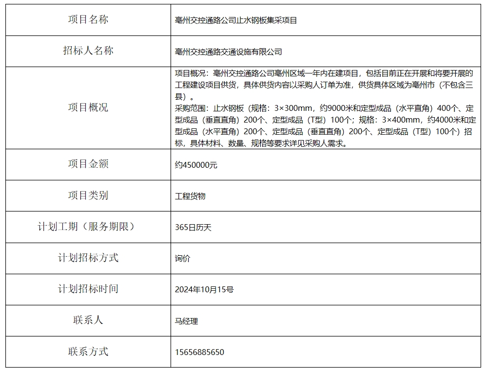 亳州交控通路公司止水鋼板集采項目招標計劃