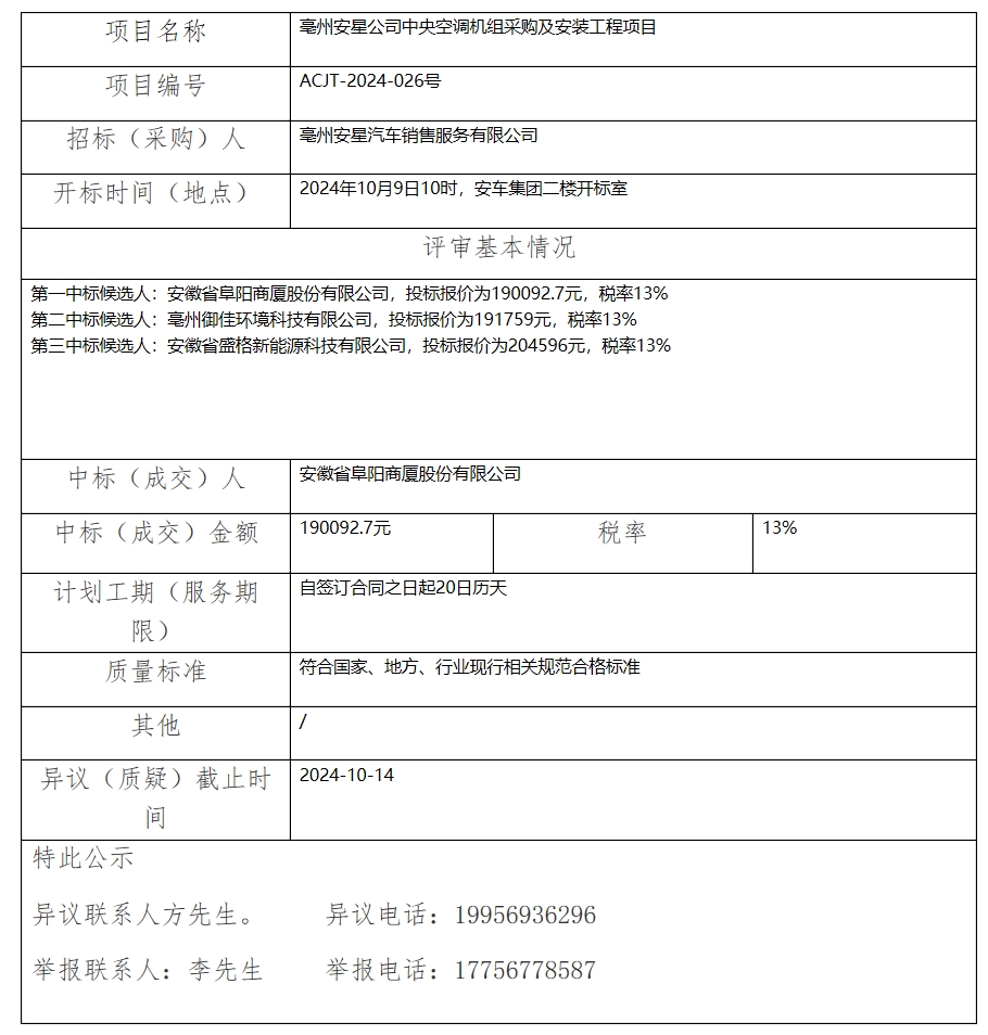 亳州安星公司中央空調(diào)機組采購及安裝工程項目中標(biāo)(成交)結(jié)果公示
