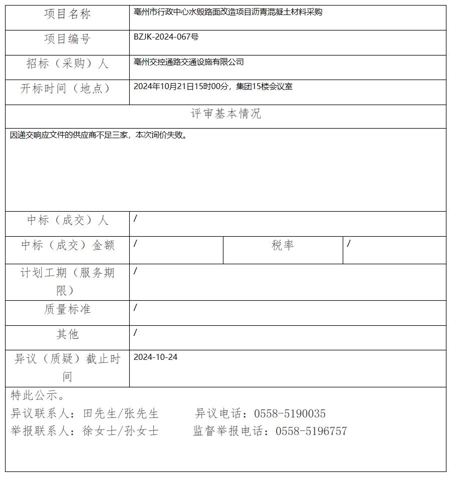 亳州市行政中心水毀路面改造項(xiàng)目瀝青混凝土材料采購中標(biāo)(成交)結(jié)果公示