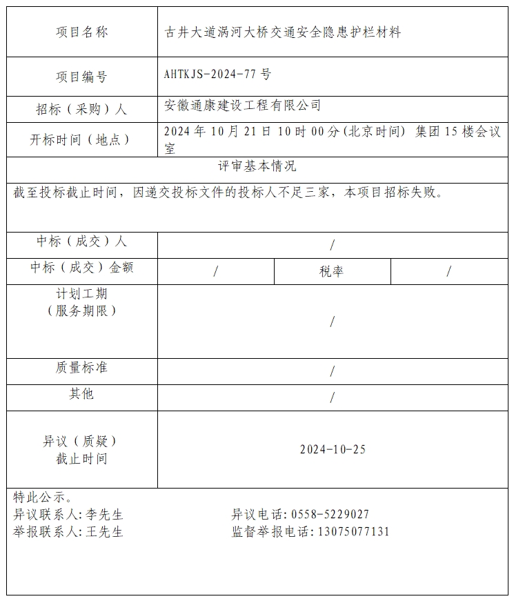 古井大道渦河大橋交通安全隱患護(hù)欄材料中標(biāo)(成交)結(jié)果公示