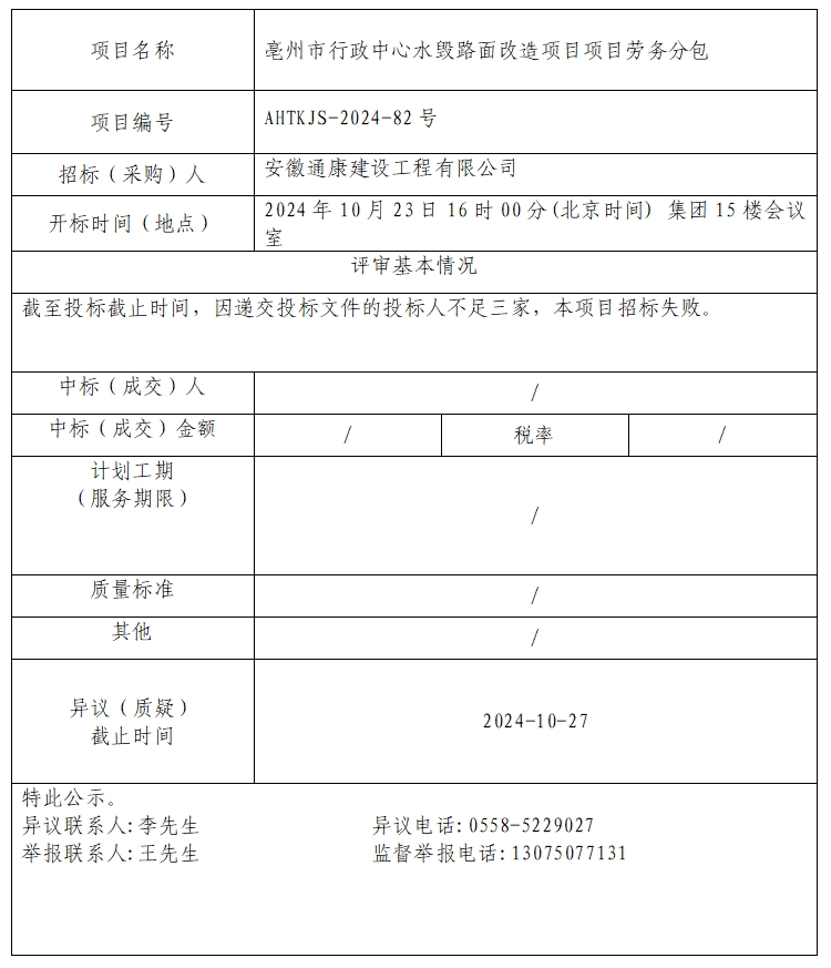 亳州市行政中心水毀路面改造項(xiàng)目項(xiàng)目勞務(wù)分包中標(biāo)(成交)結(jié)果公示