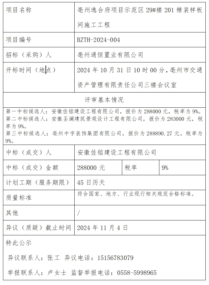 亳州逸合府項(xiàng)目示范區(qū)29#樓201精裝樣板間施工工程中標(biāo)結(jié)果公示