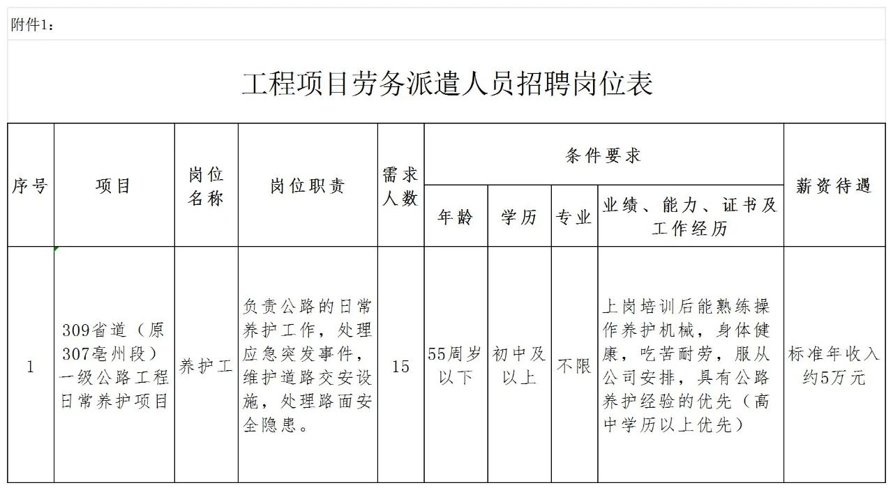 安徽通康建設(shè)工程有限公司(亳州交通投資控股集團有限公司下屬全資子公司)招聘15名勞務(wù)派遣人員,勞務(wù)派遣人員用工期隨項目工期確定,項目結(jié)束后,勞務(wù)派遣人員及時解散?,F(xiàn)將有關(guān)事項公告如下: