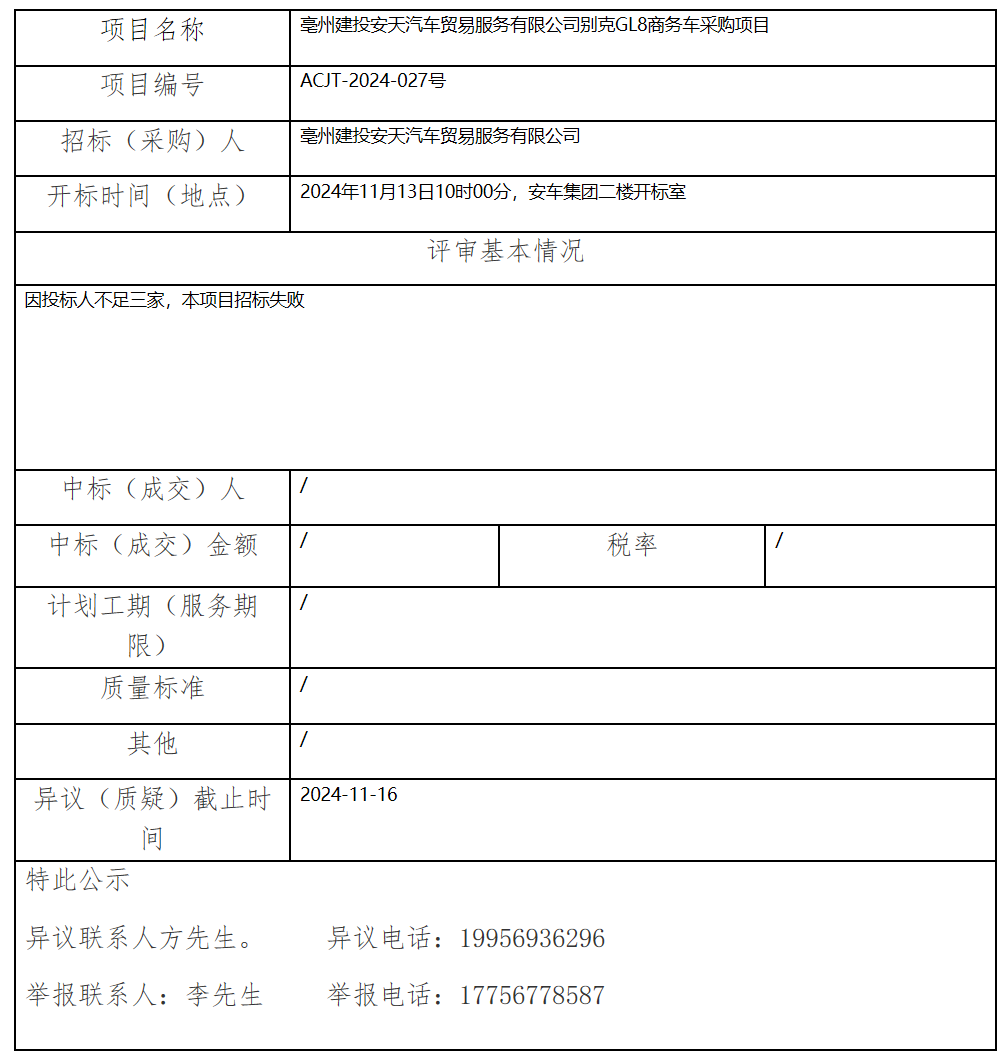 亳州建投安天汽車貿(mào)易服務(wù)有限公司別克GL8商務(wù)車采購項(xiàng)目中標(biāo)(成交)結(jié)果公示