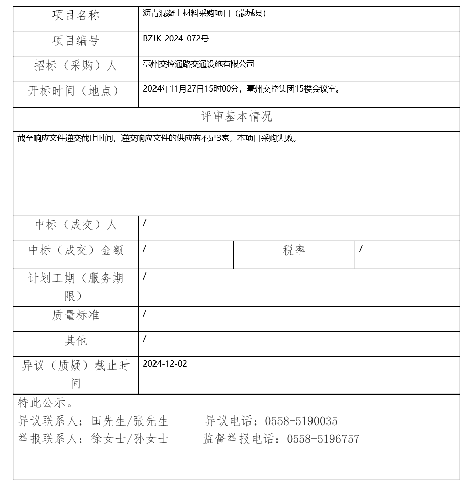 瀝青混凝土材料采購項(xiàng)目(蒙城縣)中標(biāo)(成交)結(jié)果公示