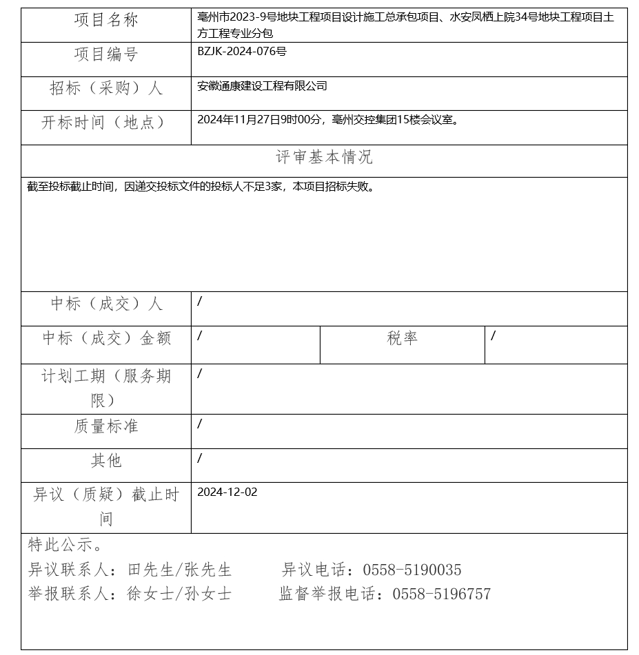 亳州市2023-9號地塊工程項目設計施工總承包項目、水安鳳棲上院34號地塊工程項目土方工程專業(yè)分包中標(成交)結果公示