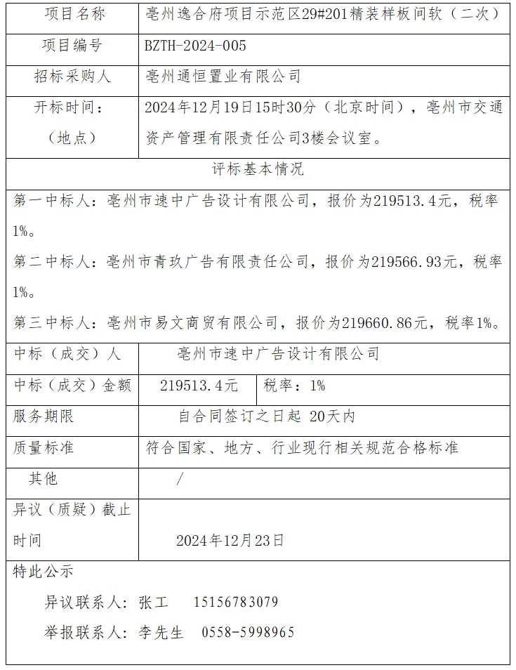 亳州逸合府項(xiàng)目示范區(qū)29#201精裝樣板間軟裝(二次) 中標(biāo)結(jié)果公示