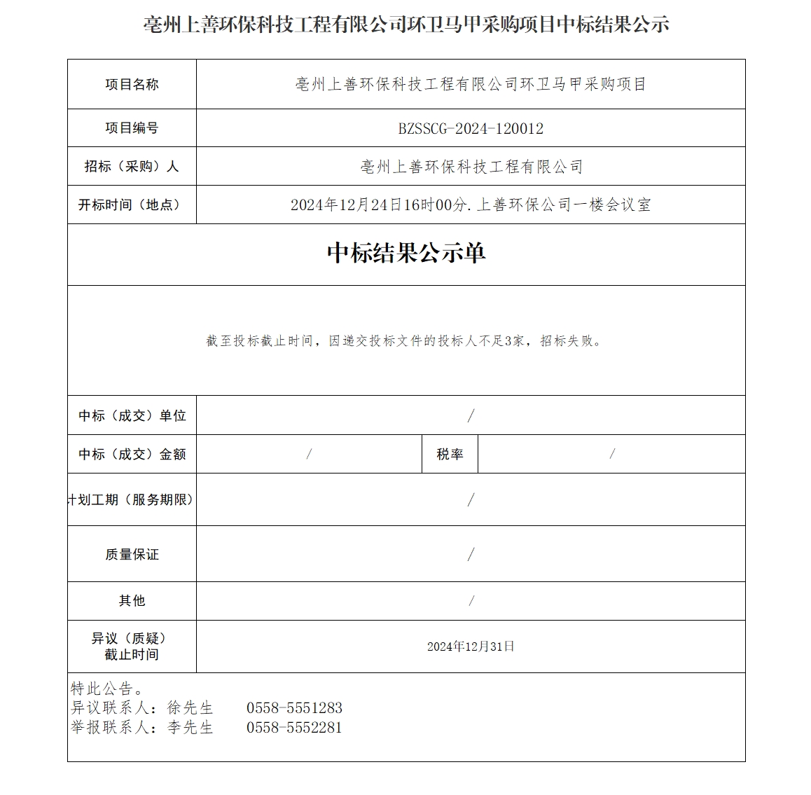 亳州上善環(huán)??萍脊こ逃邢薰经h(huán)衛(wèi)馬甲采購項目中標結(jié)果公示